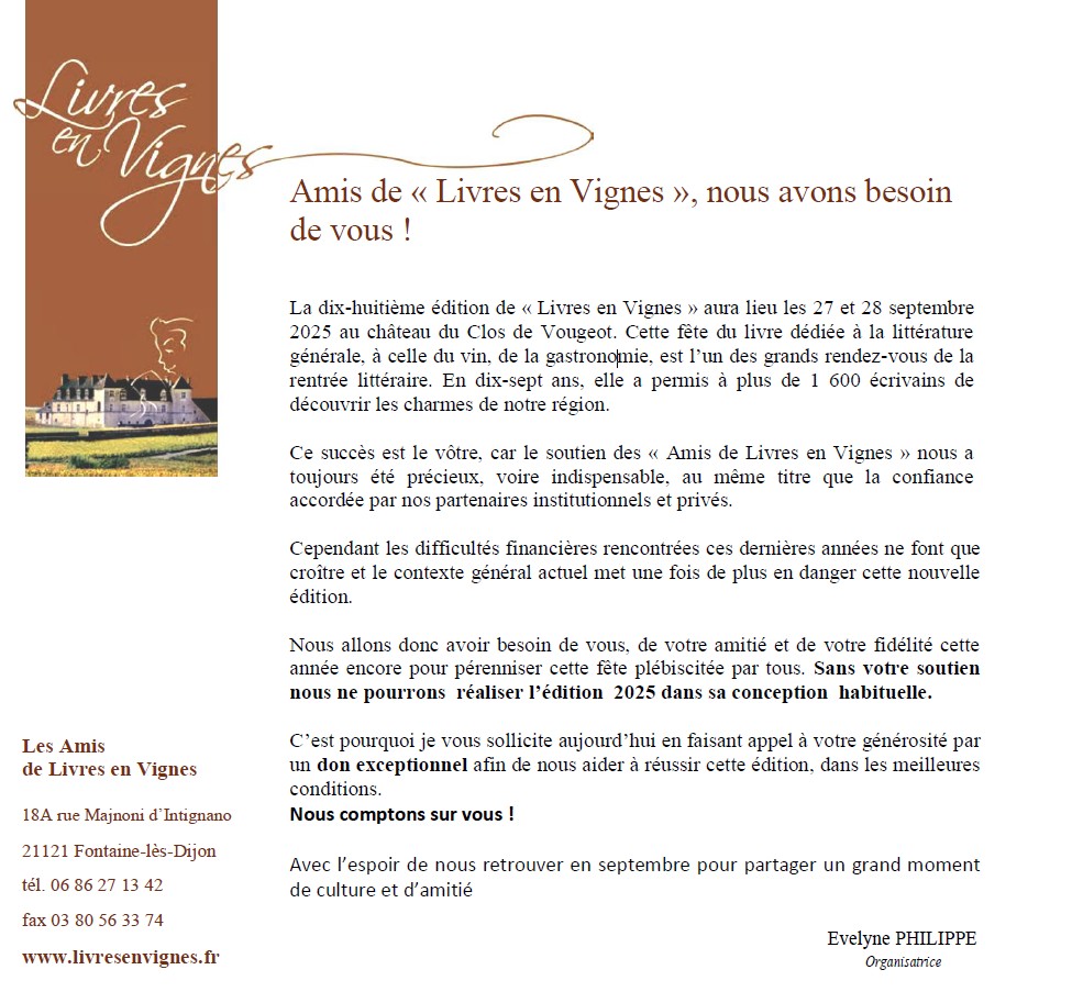 Vous souhaitez soutenir cet évènement unique en Côte d'Or ? Retrouvez la lettre des amis de Livres en Vignes :