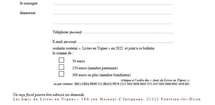 Le salon « Livres en Vignes » n’est pas financé, comme la plupart des salons du livre, par une grande ville. Privé de ce soutien stratégique, il n’existerait pas sans le soutien de nombreux mécènes, donateurs, partenaires publics et privés. L’association « Les Amis de Livres en Vignes » complète avec profit la longue liste de tous les contributeurs…